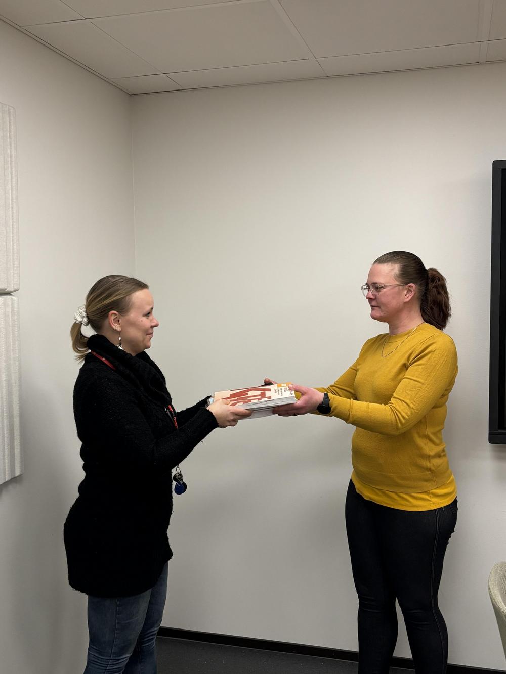 Pääluottamusedustaja Anne Stång (vas.) luovuttaa työehtosopimukset 1.2.2026 alkaen uudelle pääluottamusedustajalle Maiju Ollikainen (oik.) ❤️